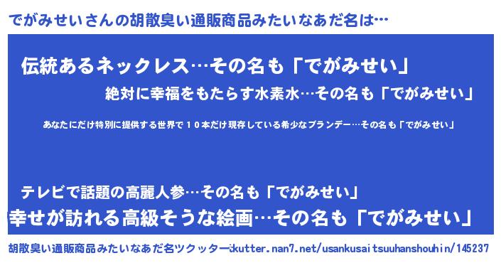 | 男性向けラノベタイトル風あだ名 | 『この素晴らしい世界にでがみせいを!』 |
