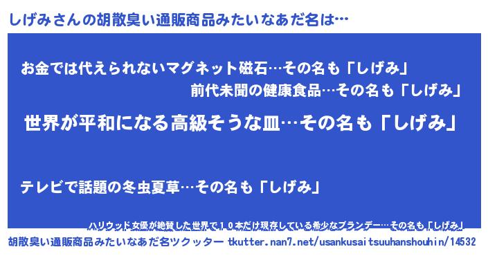 | ヘコむあだ名 | 『豆乳』『しげみ(笑)』『しげふぇ~』 |