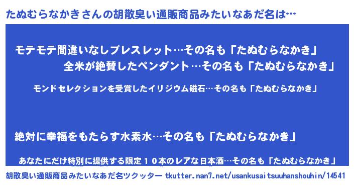| ヒーロー風カッコイイあだ名 | 『慈愛の使者たぬむらなかき』 |
