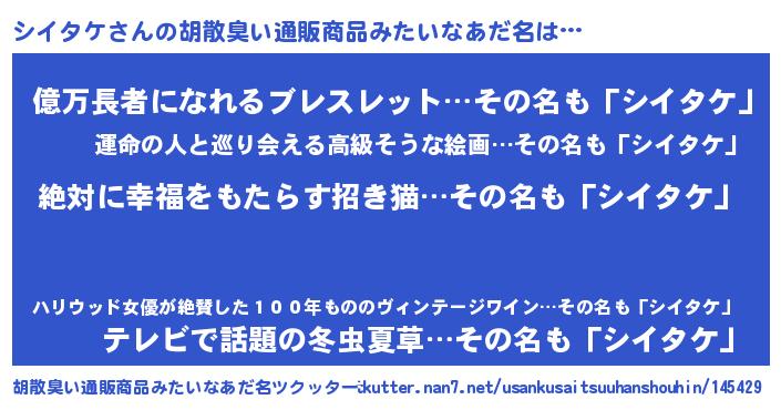 | 女子向けラノベタイトル風あだ名 | 『異世界で失敗しない100のシイタケ』 |