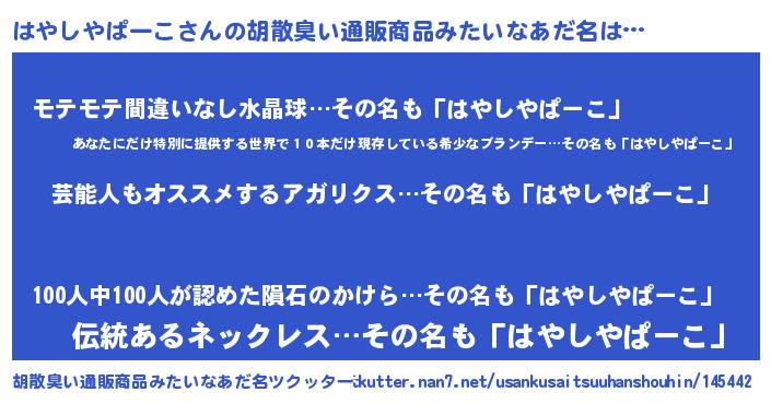 | 意味不明あだ名 | 『自称はやしやぱーこ』 |