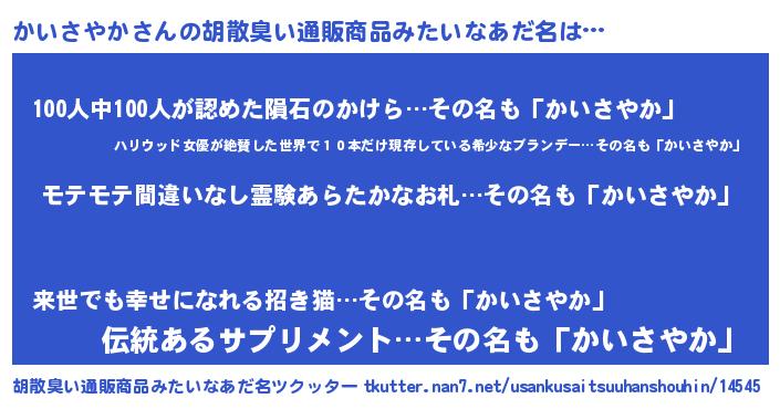 | 男性向けラノベタイトル風あだ名 | 『カイサヤカアートオンライン』 |