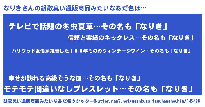 | 男性向けラノベタイトル風あだ名 | 『魔弾の王となりき』『緋弾のナリキ』 |