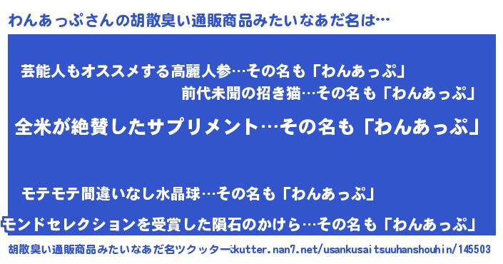 | 意味不明あだ名 | 『とにかく怪しいわんあっぷ』 |