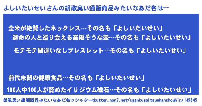 | 欧米人風あだ名 | 『アンジェラ・よしいたいせい』 |