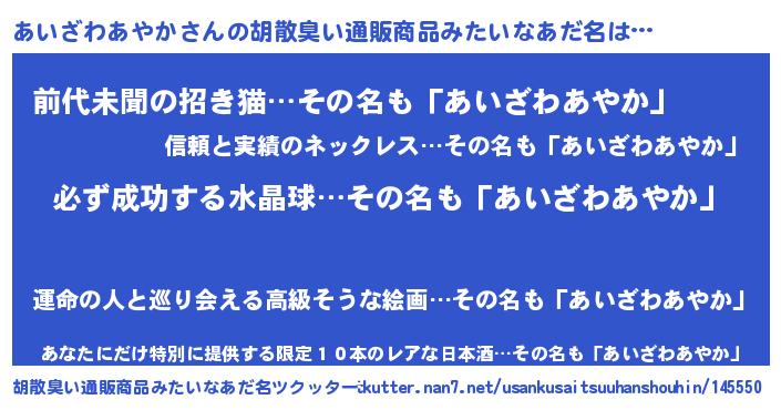 | ヘコむあだ名 | 『あいもー』『あいざわあやか(震え声)』 |