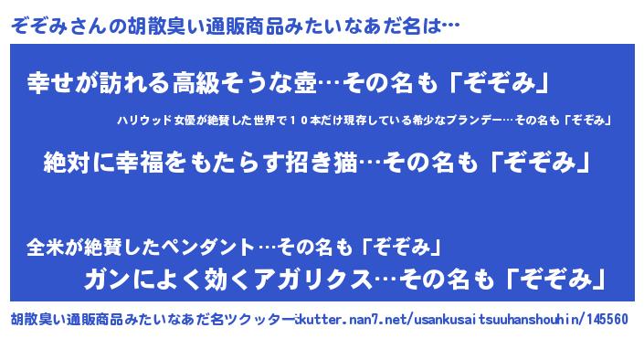 | ヘコむあだ名 | 『ぞぞみ(笑)』『牛乳』『ぞぞっぺ』 |
