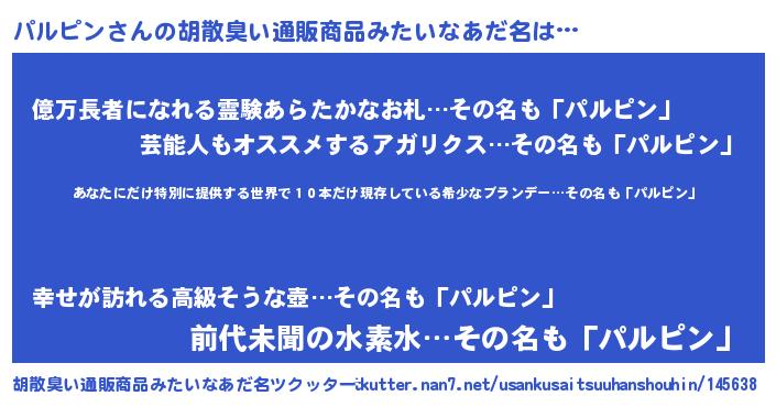 | 男性向けラノベタイトル風あだ名 | 『この素晴らしい世界にパルピンを!』 |
