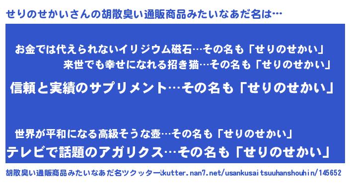 | 伝説のあだ名 | 『孤高の魔法使いせりのせかい』 |