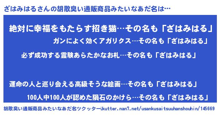 | ヘコむあだ名 | 『ざはっふぃ~』『ざはみはる(小並感)』 |