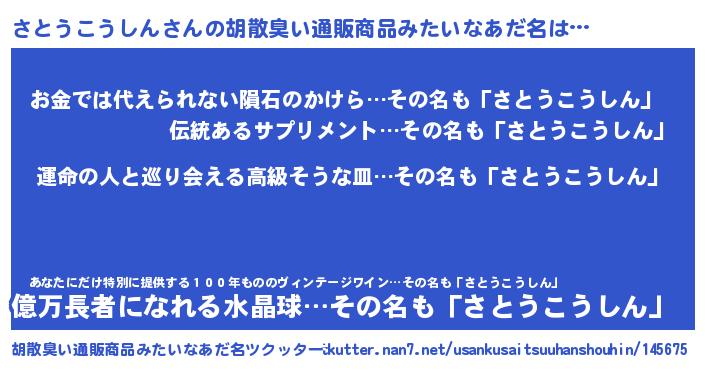| 男性向けラノベタイトル風あだ名 | 『さとうこうしん~年齢イコール彼女いない歴の魔法使い~』 |