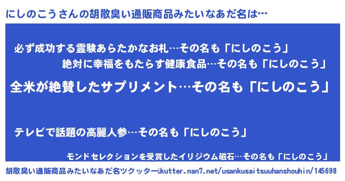 | ピコ太郎風あだ名 | 『ニシ一郎』『ニコ五郎』『ニニ太郎』 |