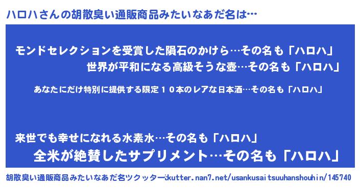 | 男性向けラノベタイトル風あだ名 | 『この素晴らしい世界にハロハを!』 |