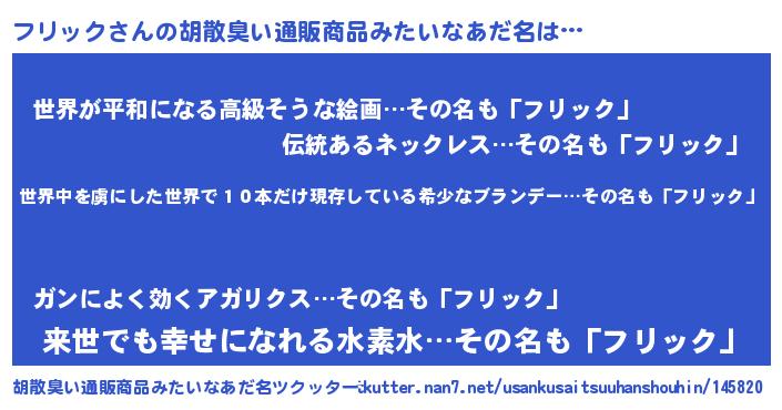 | 意味不明あだ名 | 『住所不定無職フリック(71歳)』 |