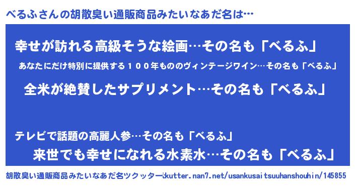 | 意味不明あだ名 | 『とにかく怪しいべるふ』 |