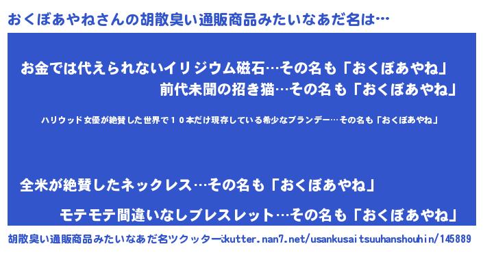| 意味不明あだ名 | 『住所不定無職おくぼあやね(71歳)』 |