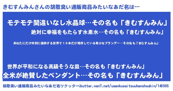 | 意味不明あだ名 | 『住所不定無職きむすんみん(84歳)』 |