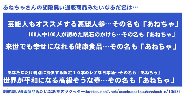 | 男性向けラノベタイトル風あだ名 | 『あねちゃという概念が存在しない退屈な世界 』 |