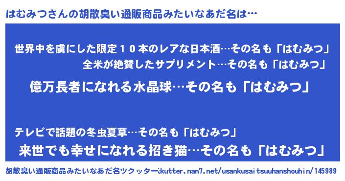 | 意味不明あだ名 | 『ペロリンはむみつ』『永久保存はむみつ』 |