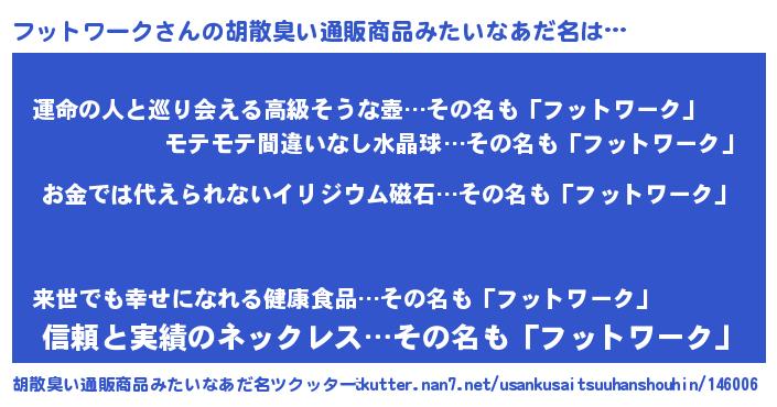 | 男性向けラノベタイトル風あだ名 | 『フットワークに滅ぼされるだけの簡単なお仕事です』 |