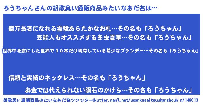 | 意味不明あだ名 | 『住所不定無職ろうちゃん(91歳)』 |