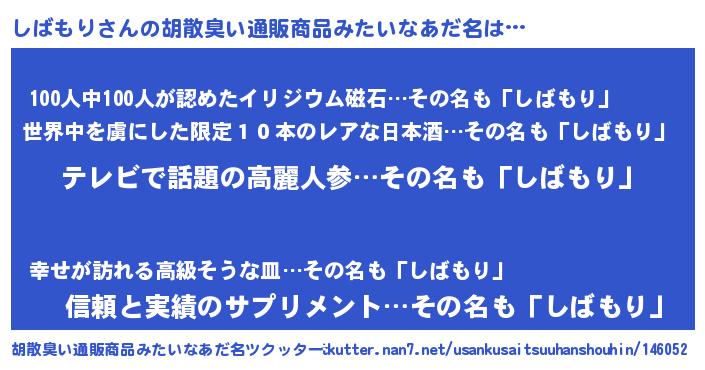 | 男性向けラノベタイトル風あだ名 | 『Re:しばもりから始める異世界生活』 |