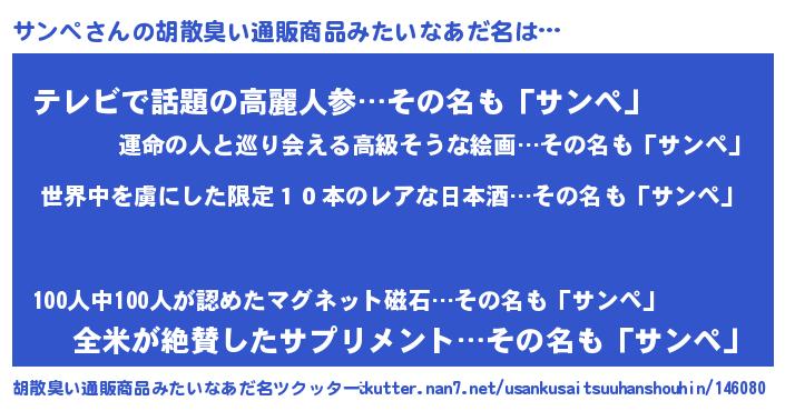 | 意味不明あだ名 | 『住所不定無職サンペ(59歳)』『自称サンペ』 |