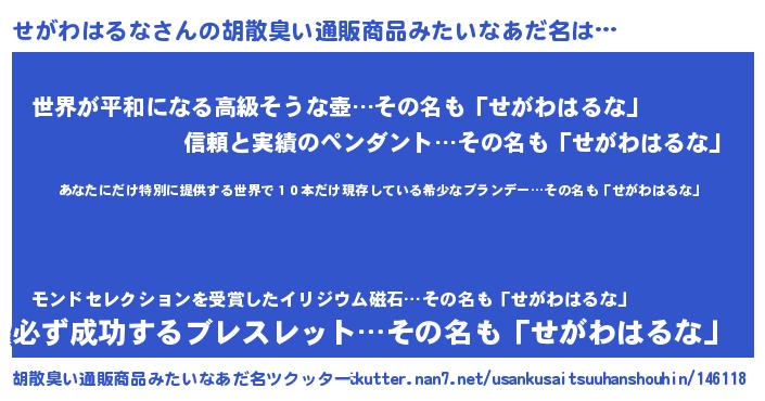 | 男性向けラノベタイトル風あだ名 | 『この素晴らしい世界にせがわはるなを!』 |