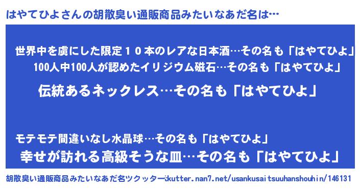 | 意味不明あだ名 | 『とにかく怪しいはやてひよ』 |