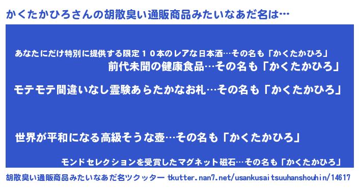 | ヘコむあだ名 | 『かくっふぃ~』『かくたかひろ(遠い目)』 |
