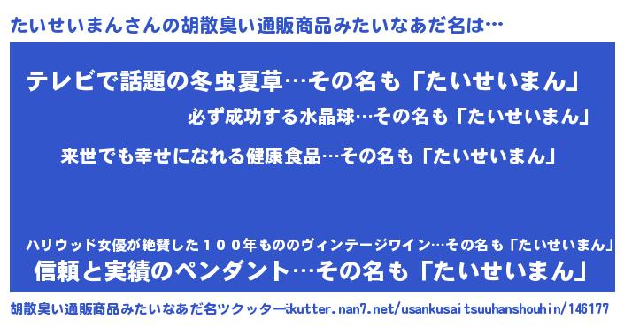 | 男性向けラノベタイトル風あだ名 | 『たいせいまんという概念が存在しない退屈な世界 』 |