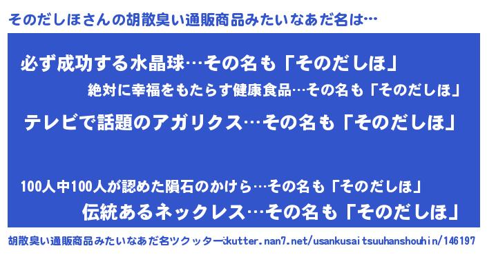 | 男性向けラノベタイトル風あだ名 | 『Re:そのだしほから始める異世界生活』 |