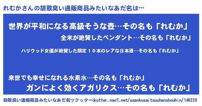 | 意味不明あだ名 | 『住所不定無職れむか(41歳)』『自称れむか』 |