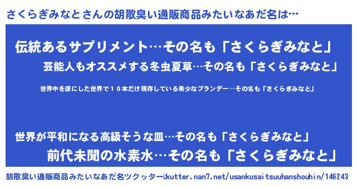 | ヘコむあだ名 | 『さくぷりん』『さくらぎみなと(小並感)』 |