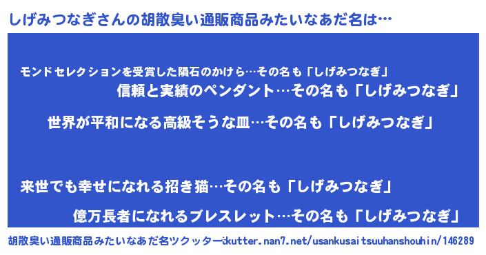 | 男性向けラノベタイトル風あだ名 | 『やはりしげみつなぎの青春ラブコメはまちがっている 』 |
