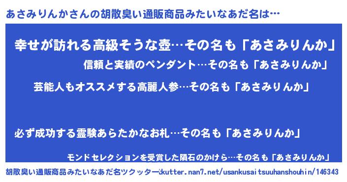 | 男性向けラノベタイトル風あだ名 | 『Re:あさみりんかから始める異世界生活』 |