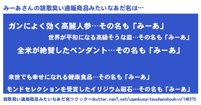 | 意味不明あだ名 | 『とにかく怪しいみーあ』『自称みーあ』 |