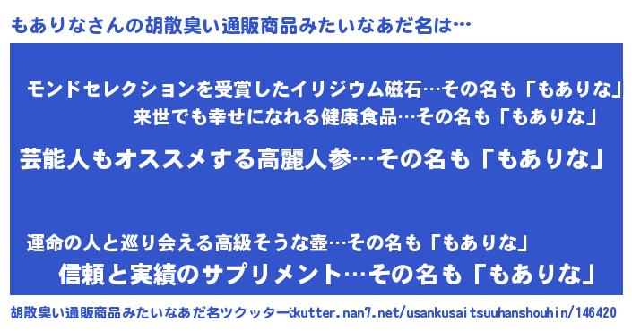 | ヘコむあだ名 | 『もあお』『もありな(遠い目)』 |
