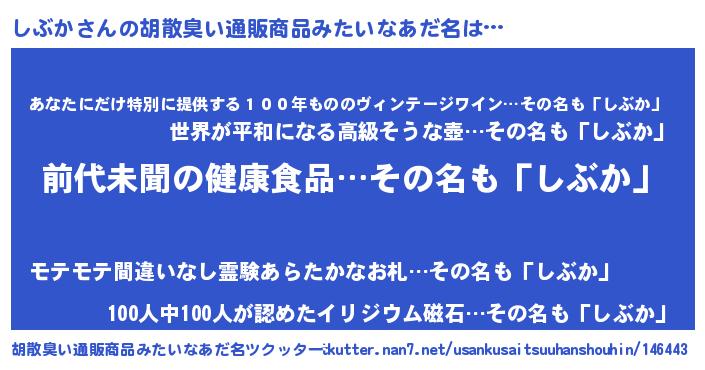 | 意味不明あだ名 | 『永久保存しぶか』『めかぶ科しぶか属』 |