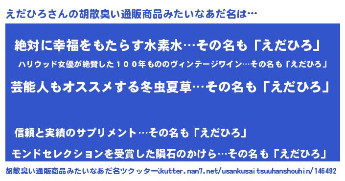 | 男性向けラノベタイトル風あだ名 | 『Re:えだひろから始める異世界生活』 |