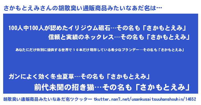 | 意味不明あだ名 | 『住所不定無職さかもとえみ(86歳)』 |