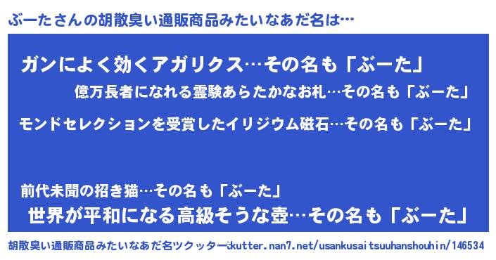 | ヒーロー風カッコイイあだ名 | 『慈愛の使者ぶーた』『超時空戦士ブータ』 |