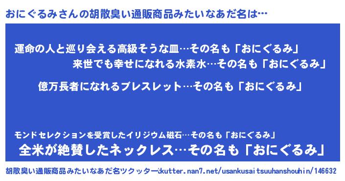 | 男性向けラノベタイトル風あだ名 | 『オニグルミアートオンライン』 |