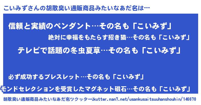 | 意味不明あだ名 | 『自称こいみず』『永久保存こいみず』 |