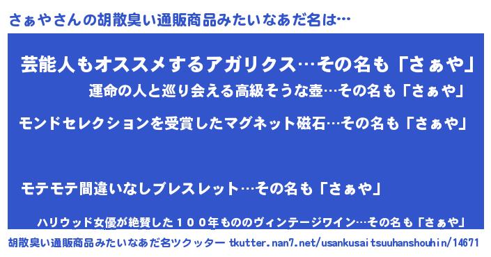 | 意味不明あだ名 | 『眠気覚ましガムさぁや味』『自称さぁや』 |