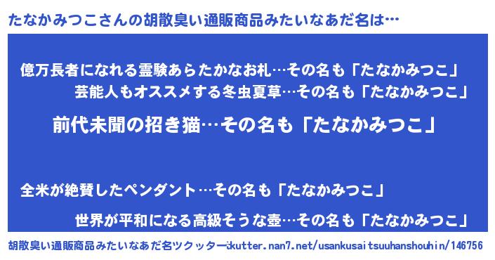| ヒーロー風カッコイイあだ名 | 『ネオタナカミツコ』『炎刃騎士タナ』 |