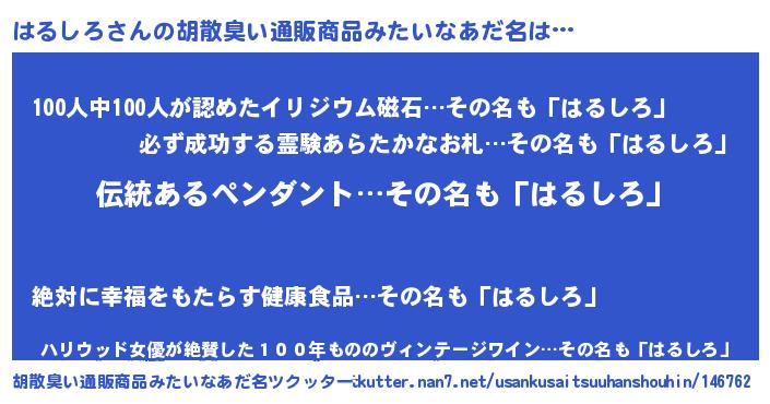 | 男性向けラノベタイトル風あだ名 | 『はるしろに滅ぼされるだけの簡単なお仕事です』 |