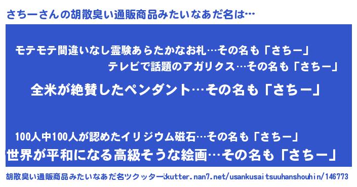 | 男性向けラノベタイトル風あだ名 | 『さちーの嫁は女の子じゃないと思った?』 |