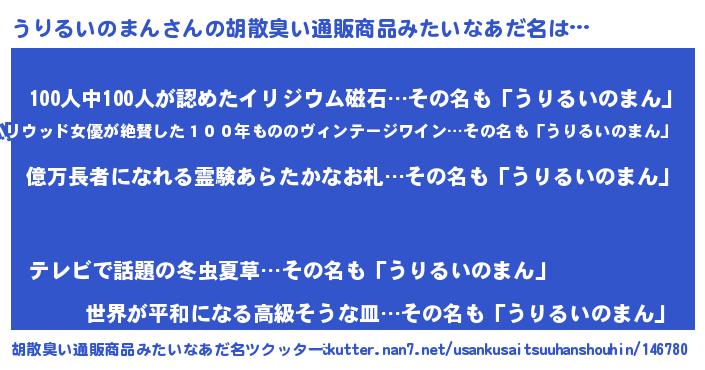 | 男性向けラノベタイトル風あだ名 | 『うちのうりるいのまんが世界を掌握している!』 |
