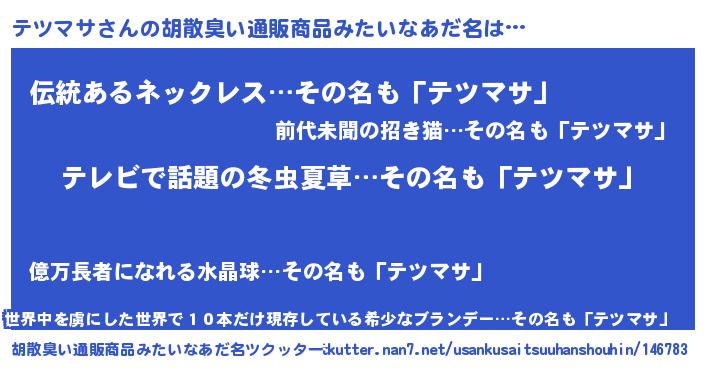 | 意味不明あだ名 | 『自称テツマサ』『たけのこ科テツマサ属』 |